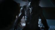 Enid in her Full-formed werewolf backwards kicks a foe.